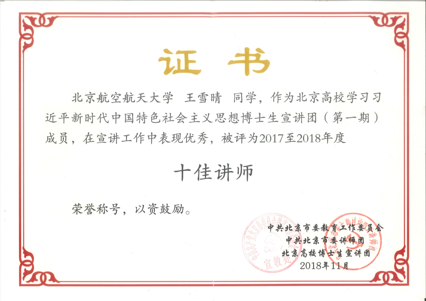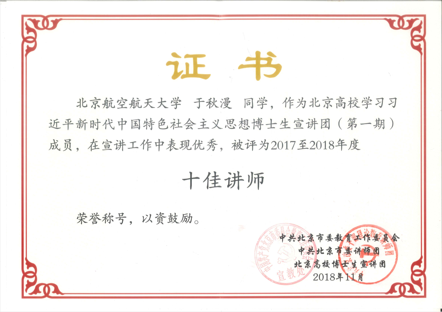 2018年11月,北京高校学习习近平新时代中国特色社会主义思想博士生宣讲团开展了2017-2018年度“十佳讲师”评选工作,北航人文学院于秋漫、王雪晴从众多讲师团成员150人中脱颖而出,获得“十佳讲师”荣誉称号。这是北航人文学院“知行唯实”小组成员获得的又一佳绩。