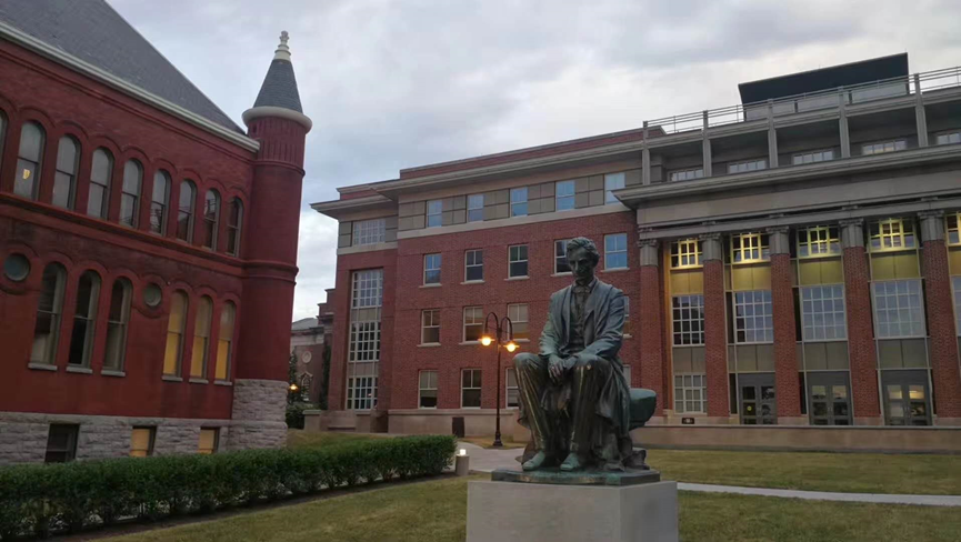 美国时间8:00,组织团队成员准时在宿舍Mariana楼门口集合。雪城大学翻译郑博与张佳翼学长如约而至,一路带我们参观校园。在Maxwell学院的林肯像旁,为我们讲述了这所学院从困境中坚持自我、严谨治学的建校历史和发展进程。体会感悟:广阔、美丽、干净、静谧的雪城大学校园总是让人沉醉其中,流连忘返,校园建筑极具特色和历史沉淀(如空难纪念花园、杜聿明设计的建筑、林肯雕像等),绿草如茵的草地上的小松鼠就在我们身旁蹦蹦跳跳、敏捷可爱,不时有老鹰盘旋上空,好一个古典与现代并存、诗意盎然而又安谧适合学习的世界!
