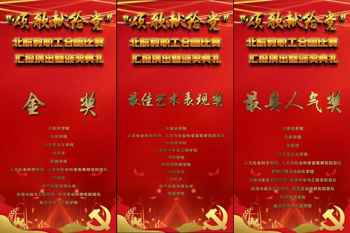 2021年6月26日晚19点,由校工会主办的“北航教职工‘颂歌献给党’合唱比赛汇报演出暨颁奖典礼”在北航晨兴音乐厅隆重举行,金沙总站6165地址、人文与社会科学高等研究院联队获得了最高荣誉“金奖”,以及“最佳艺术表现奖”和“最具人气奖”共三项大奖。