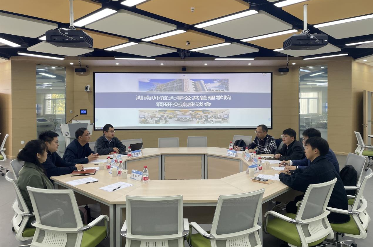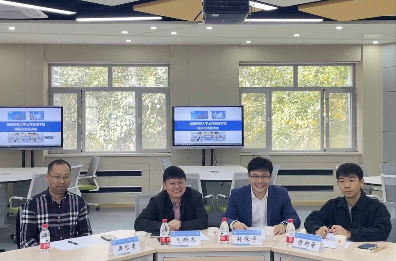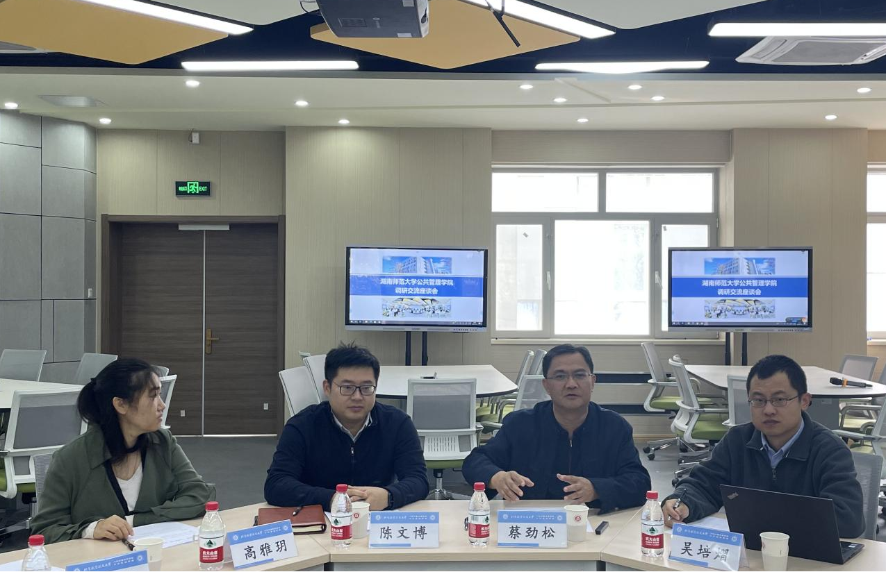 2023年11月2日上午,湖南师范大学公共管理学院院长、长沙新一代人工智能伦理治理与公共政策实验室首席专家、执行主任毛新志,长沙新一代人工智能伦理治理与公共政策实验室副主任孙保学、蒋乐勇等一行到我院就实验室建设进行经验交流。人文公管学院院长蔡劲松、副院长陈文博、教师代表吴培熠、高雅玥参加此次交流活动,座谈会由陈文博副院长主持。
