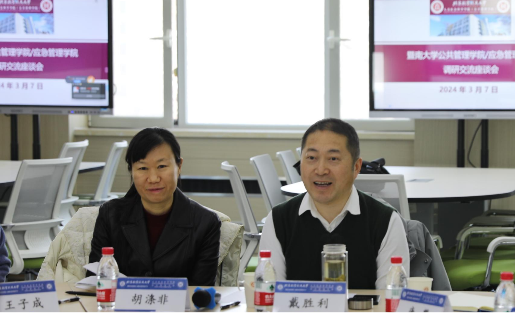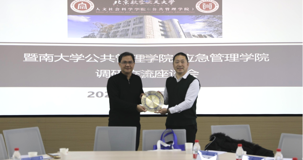 会议最后,戴胜利院长对人文公管学院的盛情接待表示感谢,也期待今后两院之间可以进一步加强交流合作、共谋发展,并暨南大学公共管理学院(应急管理学院)向北航人文公管学院赠送纪念品。