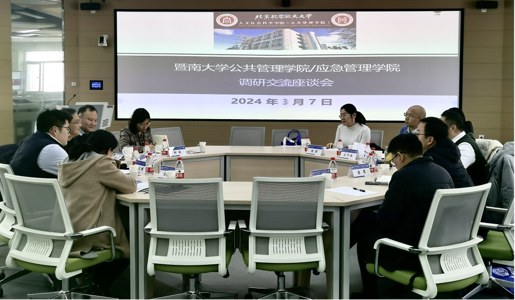 暨南大学公共管理学院/应急管理学院戴胜利院长表示很荣幸在开学之初来到北航人文公管学院进行交流访问,随后介绍了暨南大学公共管理学院的发展现状及此次调研的目的,希望双方能就公共管理学科建设与特色学科方向设置、师资队伍建设与有组织的科研、公共管理博士与硕士人才培养、MPA人才培养等问题展开深入交流。