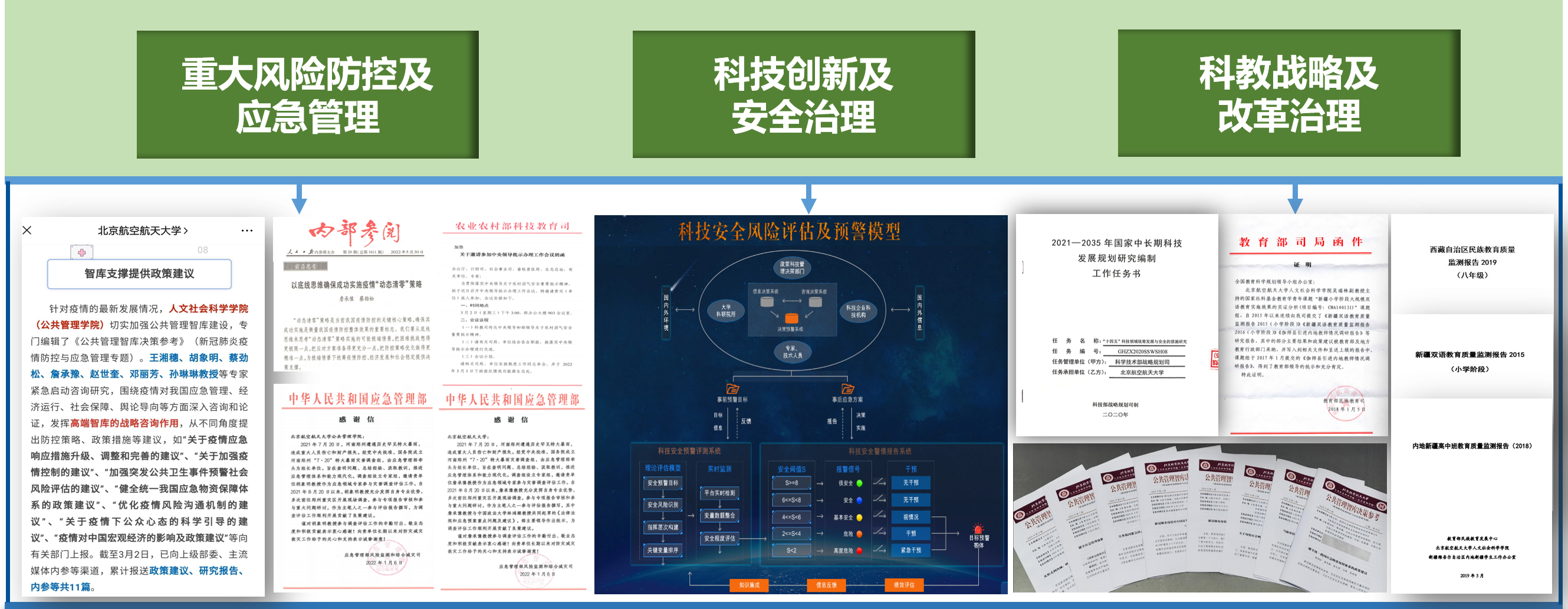 学院聚焦国家治理体系和治理能力现代化战略需求,持续强化有组织的科研创新,研究成果获评高等学校科学研究优秀成果奖(人文社会科学)一等奖1项,实现了北航获国家文科最高等级奖励一等奖“零突破”。近五年,学院还获得全国教育科学研究优秀成果奖、北京市哲学社会科学优秀成果奖、工业和信息化优秀研究成果奖、民政部优秀研究成果奖等重要标志性奖励十余项。获批国家级纵向课题持续增长,其中近三年学院获批国家社科基金重大重点项目、国家自然科学基金重点项目等7项。学院教师发表出版了一大批具有相当学术价值和影响力的论文、专著、译著和研究报告。加强中国特色新型文科智库建设,平均每年向上级提交50余篇资政报告,其中三分之一被中央及省部级领导批示或被采纳。文工交叉科研创新平台矩阵建设取得新进展,新建成的“公共管理系统工程实验室”发挥科教融合、协同育人作用凸显,科研创新迈入内涵发展、跨越提质的新阶段。