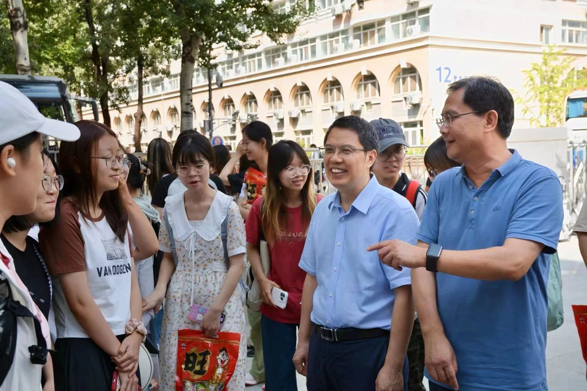 8月21日,人文公管学院2023级本科生从沙河校区搬迁至学院路校区,学院院长蔡劲松、党委书记王琪全、党委副书记方志、团委书记黄焘到搬迁车辆下车点迎接,与学生们亲切交流,向他们表示热烈欢迎并送上慰问礼包。宿舍搬迁后,学院开展了宿舍走访慰问。