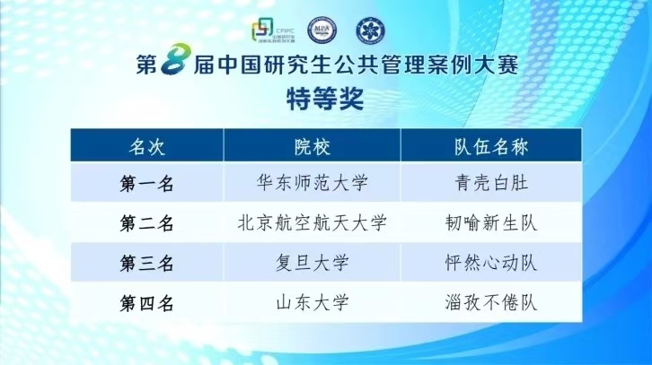 刚刚落幕的第九届中国研究生公共管理案例大赛上,北航人文公管学院还获得调研报告一等奖、最有价值队员(陈梦祥)、最佳指导教师(陈文博、张路蓬)、2项优秀奖(指导教师分别为刘亚娜和陈文博)和优秀组织单位等荣誉。
