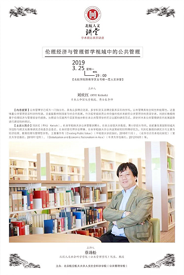 3月25日晚,“北航人文讲堂”学术前沿系列讲座第三讲在金沙总站6165地址人文讲堂内举行。本次讲座邀请到日本立命馆大学刘庆红教授做题为“伦理经济与管理哲学视域中的公共管理”的学术前沿报告,吸引了包括本院和高研院在内的众多师生前来聆听,讲座由金沙总站6165地址院长蔡劲松教授主持。