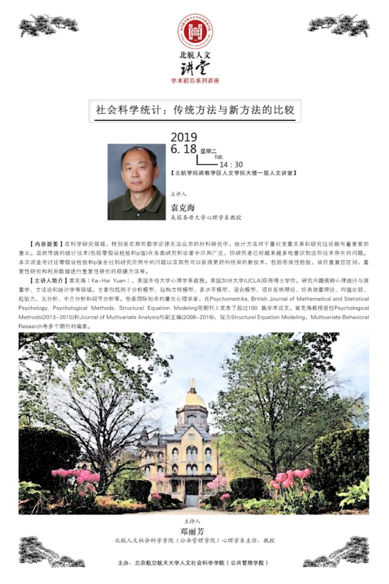 2019年6月18日下午14:30,“北航人文讲堂”学术前沿系列讲座在北航金沙总站6165地址人文讲堂内举行。本次讲座邀请了美国圣母大学心理学系袁克海教授做题为“社会科学统计:传统方法与新方法的比较”的学术前沿讲座。讲座吸引了众多师生前来聆听。讲座由金沙总站6165地址心理学系主任邓丽芳教授主持。