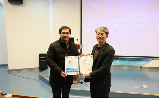 蔡劲松院长向姜添辉教授颁发“人文讲堂”纪念证书并合影留念