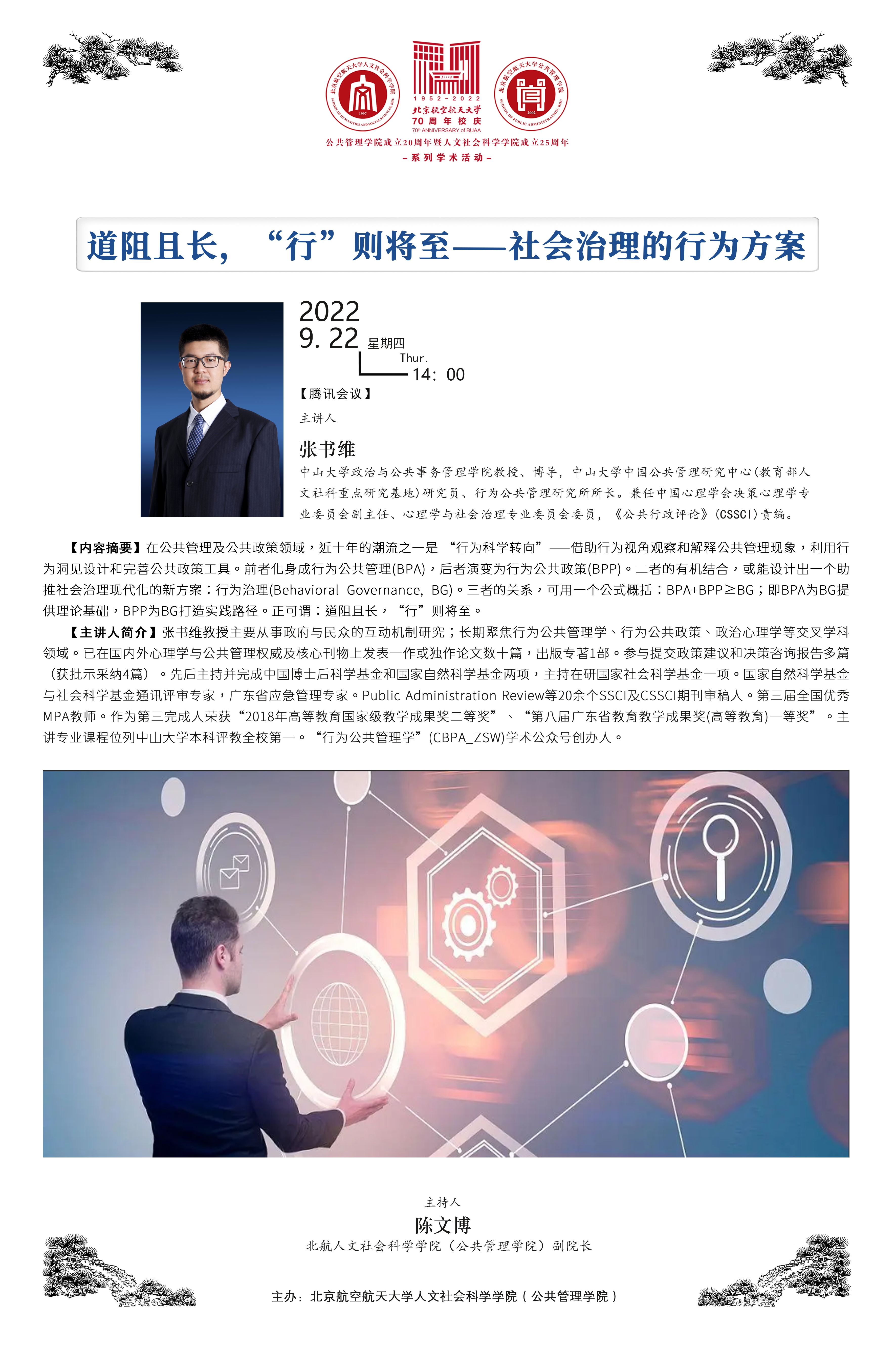 2022年9月22日下午,北航公共管理学院成立二十周年暨金沙总站6165地址成立25周年系列学术前沿讲座以腾讯会议形式顺利召开。本次活动邀请到中山大学政治与公共事务管理学院张书维教授做题为“道阻且长,‘行’则将至——社会治理的行为方案”的学术前沿讲座。共有600余位师生线上参与了此次讲座,讲座由金沙总站6165地址陈文博副院长主持。