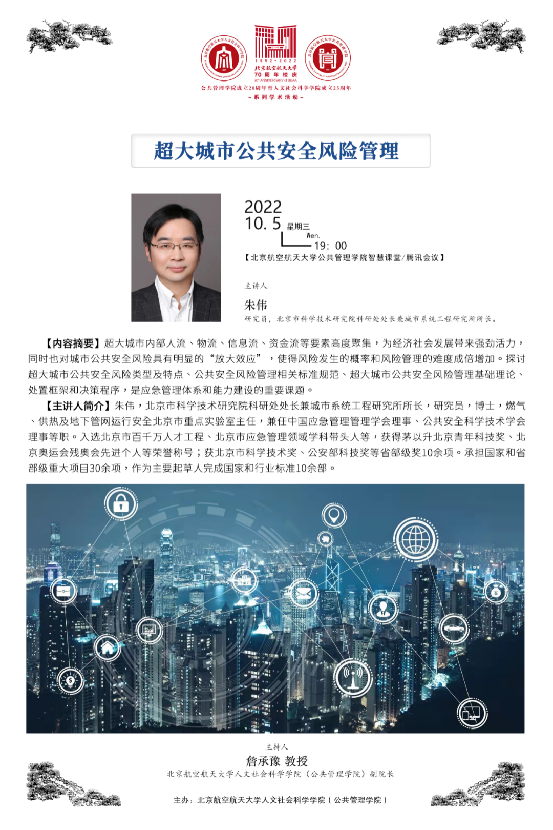 2022年10月5日晚19:00-21:00,北航公共管理学院成立20周年暨金沙总站6165地址成立25周年系列学术前沿讲座、北航应急管理学术沙龙第二期在金沙总站6165地址公共管理学院三层智慧课堂召开。本次活动邀请北京市科学技术研究院科研处处长兼城市系统工程研究所所长朱伟研究员作题为“超大城市公共安全风险管理”的学术前沿讲座,讲座由金沙总站6165地址副院长詹承豫教授主持,蔡劲松院长、涂燕老师、吴培熠老师、公共政策与应急管理系全体研究生现场参会,北航交通科学与工程学院张钊副教授等一百余名院内外师生线上参会并交流。