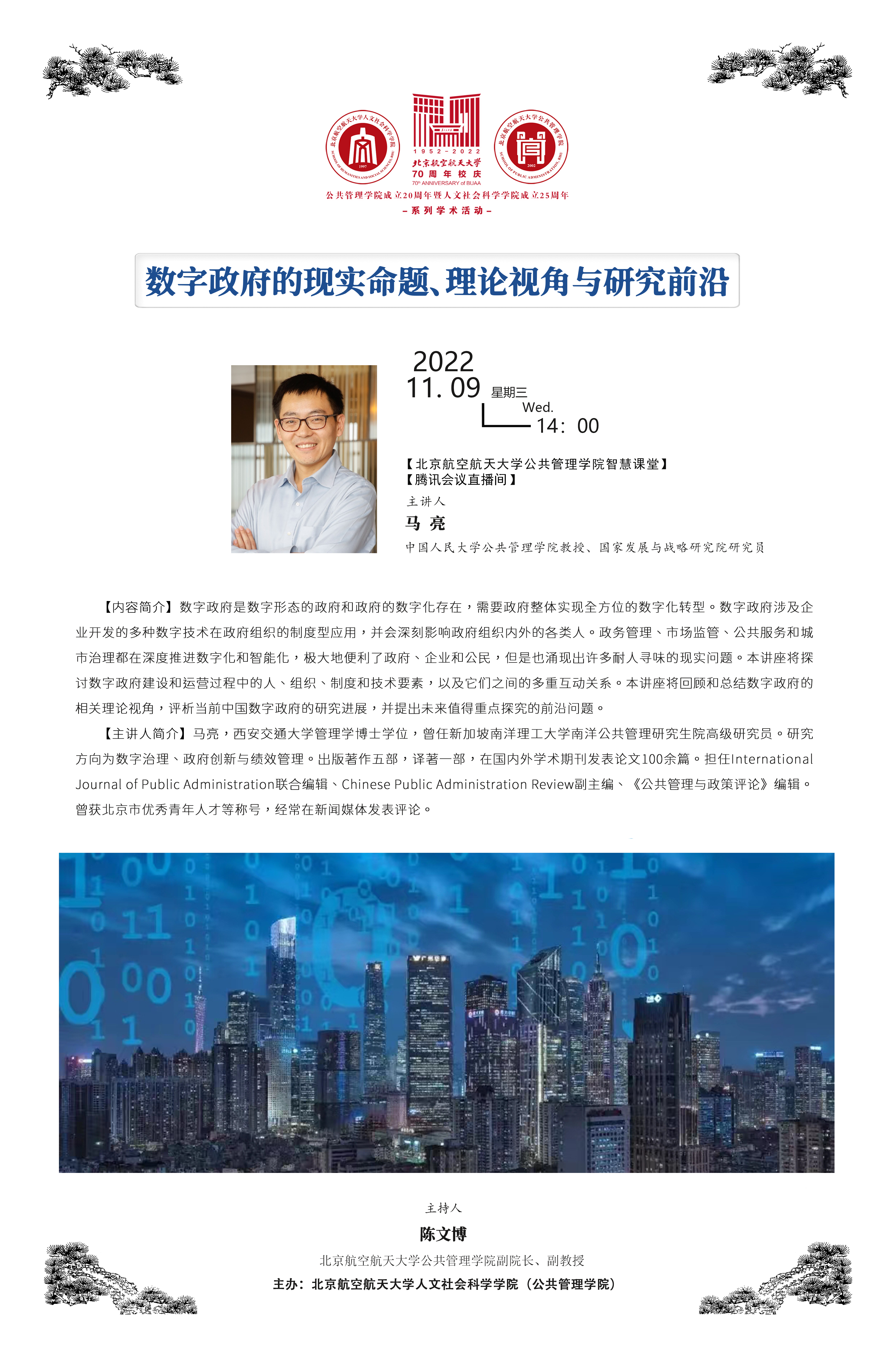 11月9日,金沙总站6165地址公共管理学院成立20周年暨金沙总站6165地址成立25周年系列学术前沿讲座在学院智慧课堂举行。本次活动邀请中国人民大学公共管理学院教授、国家发展与战略研究院研究员马亮作题为“数字政府的现实命题、理论视角与研究前沿”的学术前沿讲座。讲座由金沙总站6165地址副院长陈文博主持。