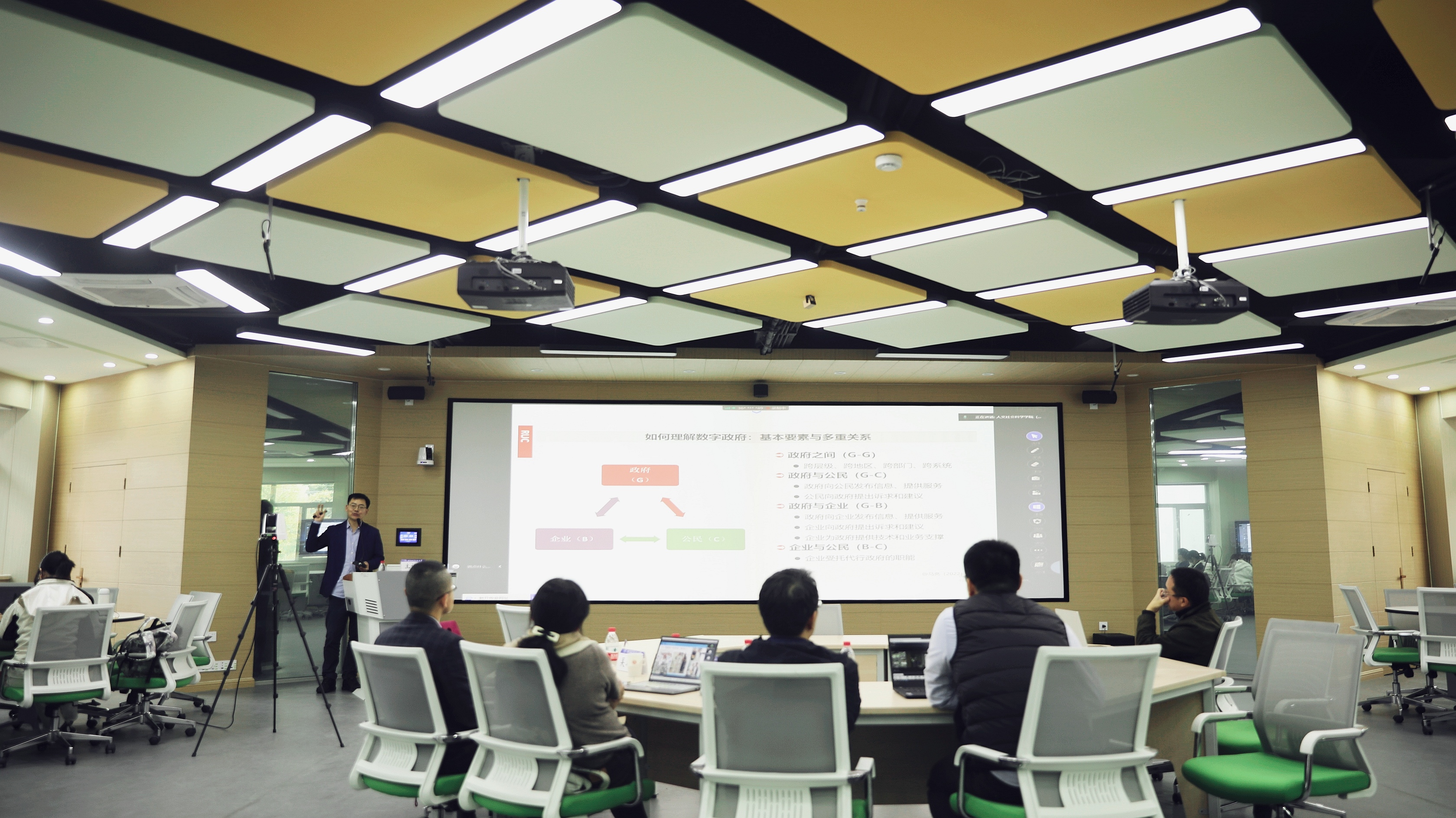 马亮教授首先从核心概念讲起,并以本次讲座使用的智慧课堂为例,提出如何正确理解数字政府。同时,通过讲解数字治理中政府、企业和公民三者的相互关系,阐述了数字政府的基本要素与多重关系,强调在数字政府建设和运行过程中,政府、企业和公民是相互双向联系的。