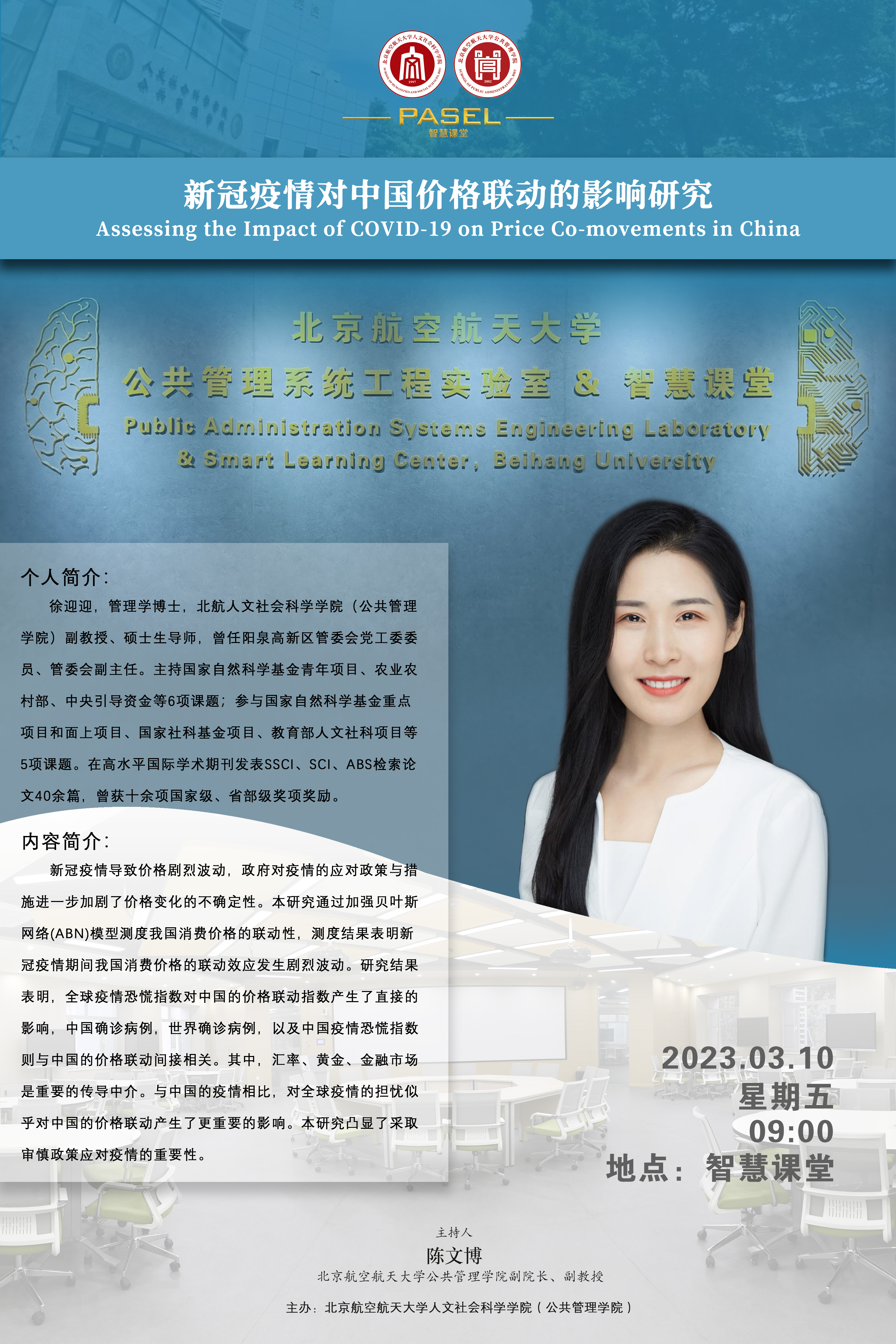 3月10日,PASEL·智慧讲堂”系列讲座在北航人文公管学院智慧课堂举办本期讲座由徐迎迎副教授主讲“新冠疫情对中国价格联动的影响研究”。学院院长蔡劲松,副院长詹承豫、陈文博,教师代表何平林、黄文、牛朝辉、吴培熠以及30多位学生参加讲座并互动研讨,讲座由学院副院长陈文博主持