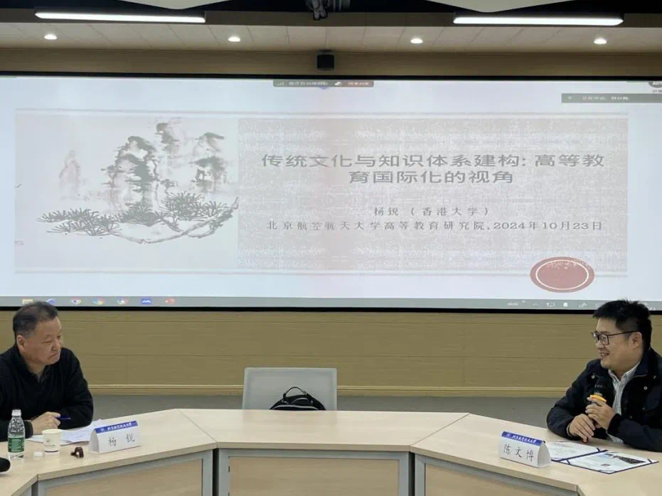 10月23日,香港大学教育学院院长杨锐教授做客“人文讲堂”,为北航人文公管学院带来“传统文化与知识体系建构:高等教育国际化的视角”的学术报告。此次讲座由金沙总站6165地址主办,也是北航世界顶尖大学学者合作计划和北航学科引智平台建设计划的系列活动之一,同时也得益于首都高等教育发展研究基地的大力支持。金沙总站6165地址副院长陈文博教授、马永红教授、包艳华副教授、涂燕老师、杜佳卉博士后、北航法国研究中心副主任萨日娜教授、马克思主义学院博士后任政等出席讲座,多学院师生积极参与了此次活动。讲座由金沙总站6165地址刘扬教授主持。