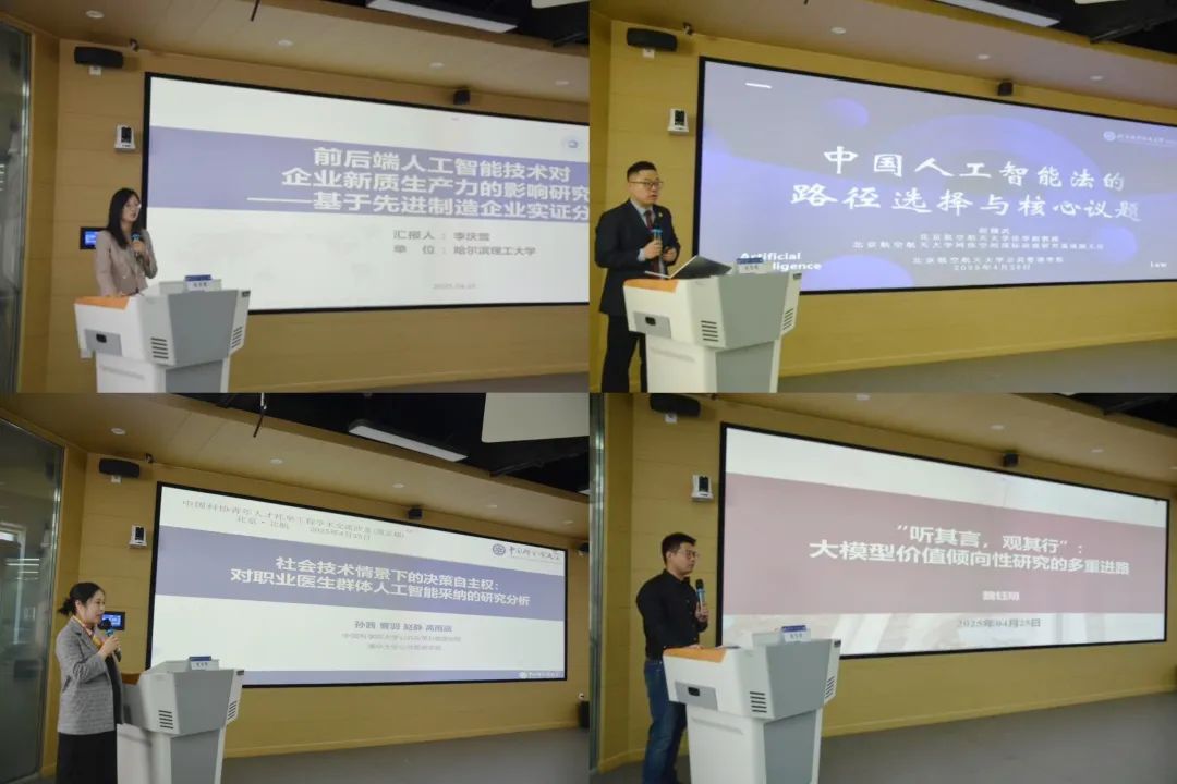 随后,八位青年学者依次发表专题报告。在上半场,哈尔滨理工大学李庆雪副教授通过实证分析揭示人工智能技术对企业生产力的多维影响,指出动态能力与人力资本在技术转化中的关键作用;金沙总站6165地址赵精武副教授从法学视角剖析AI治理的路径争议,提出需平衡创新激励与风险管控;中国科学院大学孙茜副教授基于医疗场景研究,强调人机交互对医生决策自主权的赋能价值;清华大学魏钰明助理研究员则通过多重方法论,解析大模型价值倾向性研究的科学路径。