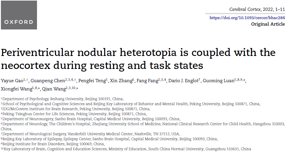 近日,我院高雅玥助理教授在期刊《CEREBRAL CORTEX》(影响因子4.86,中科院一区Top期刊)合作发表题为Periventricular nodular heterotopia is coupled with the neocortex during resting and task states的学术论文(https://doi.org/10.1093/cercor/bhac284)。本篇论文揭示了异位的灰质组织与正常皮层功能连接的时空特性,并提出了神经元迁移异常后共同发育的假说。