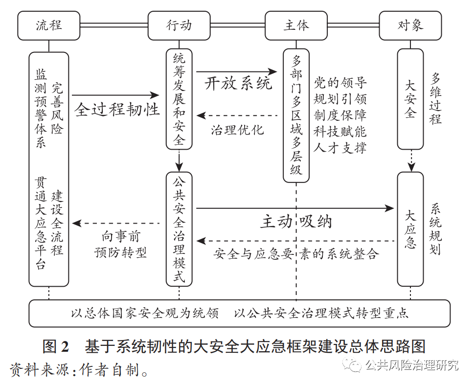 第三,建立大安全应急框架是一个长期系统工程,可以提升系统韧性为抓手,逐步完善并优化建设实践。系统韧性概念的引入为理解大安全大应急框架提供了一个理论视角。具体而言,其建设过程要主动吸纳各类安全与应急要素、建设形式应形成具有包容性的开放系统、建设目标应能够保障公共安全治理的全过程韧性。以提升系统韧性为抓手,对理顺其现实建设路径提供了理论支撑,有助于大安全大应急框架理论探索与建设实践的有效互动。