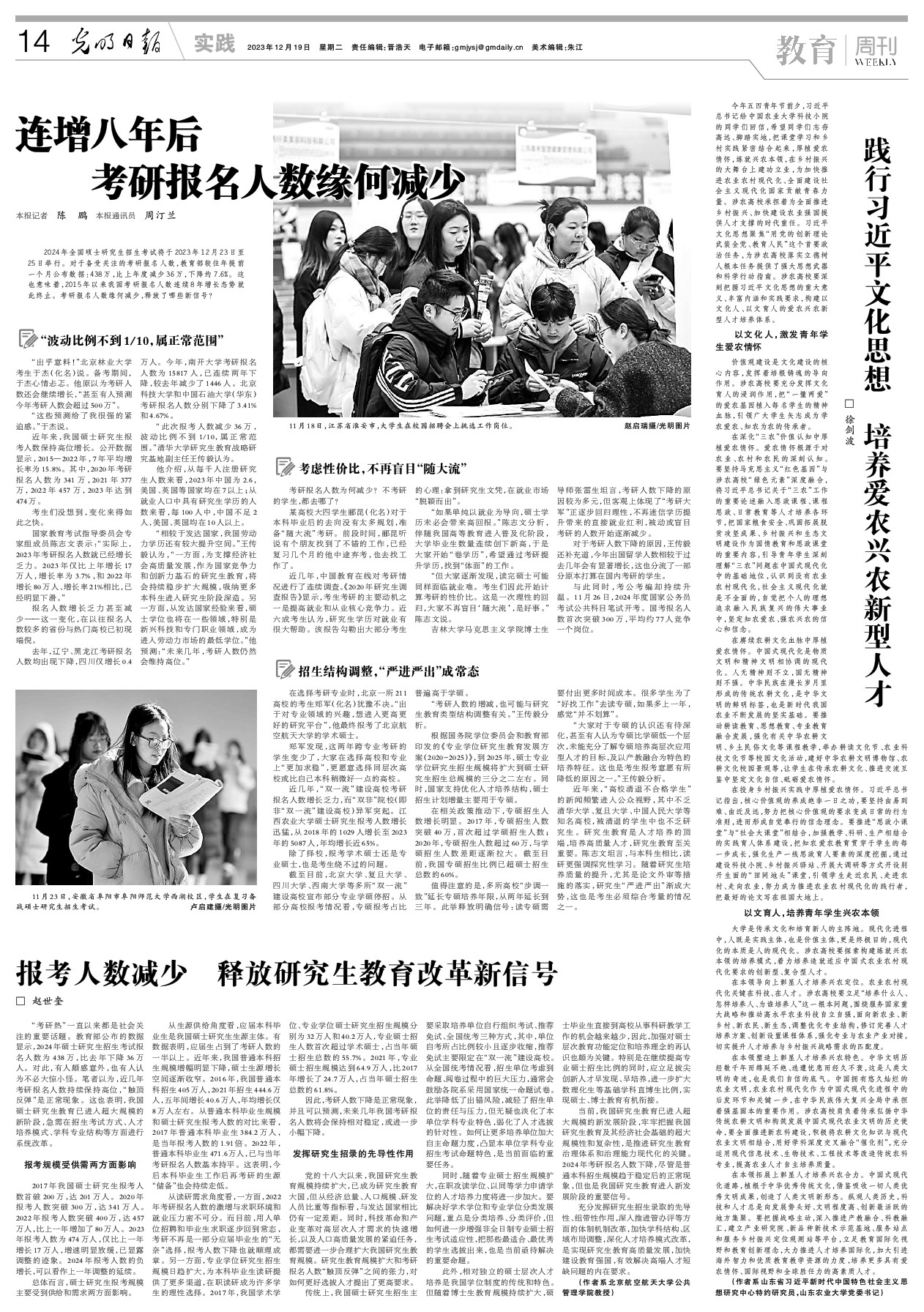 “考研热”一直以来都是社会关注的重要话题。教育部公布的数据显示,2024年硕士研究生招生考试报名人数为438万,比去年下降36万人。对此,有人颇感意外,也有人认为不必大惊小怪。笔者以为,近几年考研报名人数持续保持高位,“触顶反弹”是正常现象。这也表明,我国硕士研究生教育已进入超大规模的新阶段,急需在招生考试方式、人才培养模式、学科专业结构等方面进行系统改革。