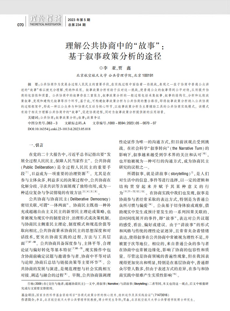 近日,金沙总站6165地址李亚教授和博士研究生贾鑫同学,于《理论探讨》发表《理解公共协商中的“故事”:基于叙事政策分析的途径》一文,以下为文章全文。