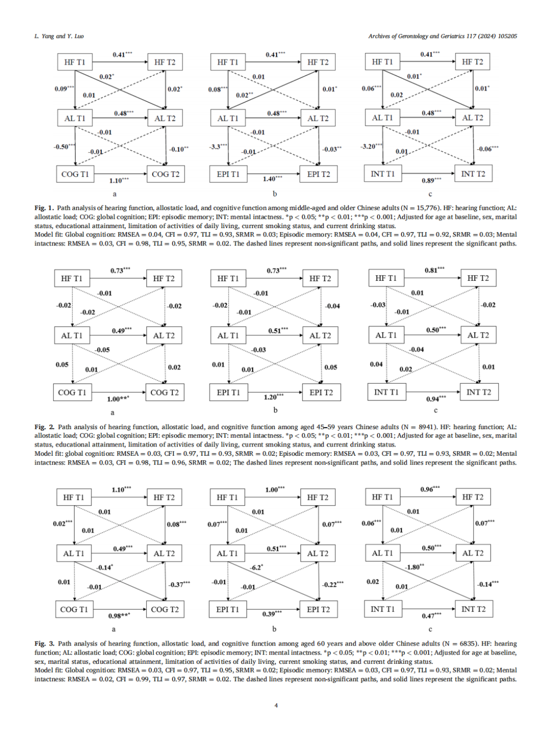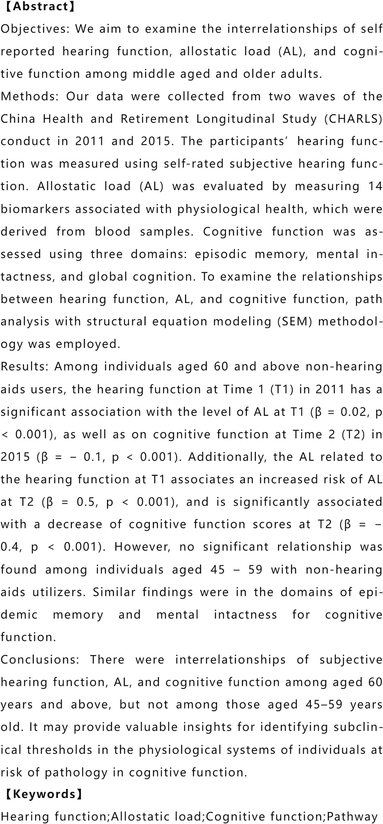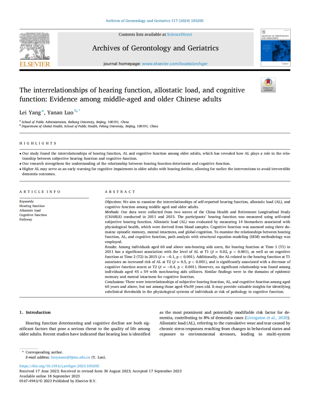 近日,金沙总站6165地址杨磊副教授与北京大学公共卫生学院罗雅楠副研究员合作的文章《The interrelationships of hearing function,allostatic load,and cognitive function: Evidence among middle-aged and older Chinese adults》在SSCI期刊《Archives of Gerontology and Geriatrics》上发表,以下为文章全文。