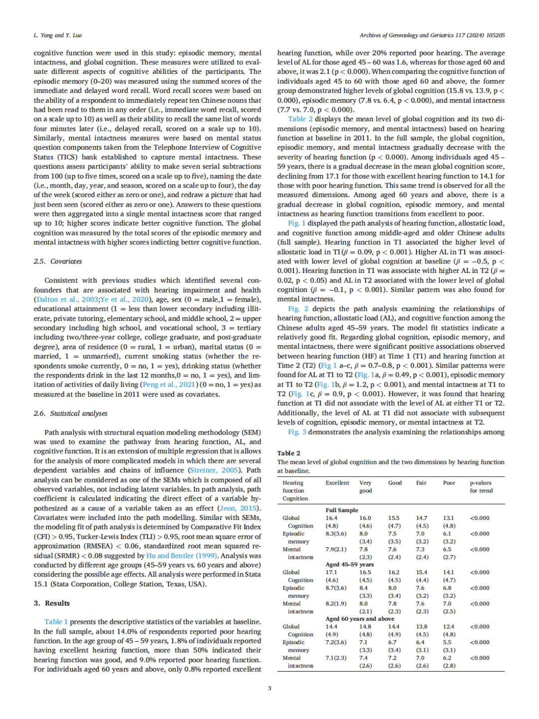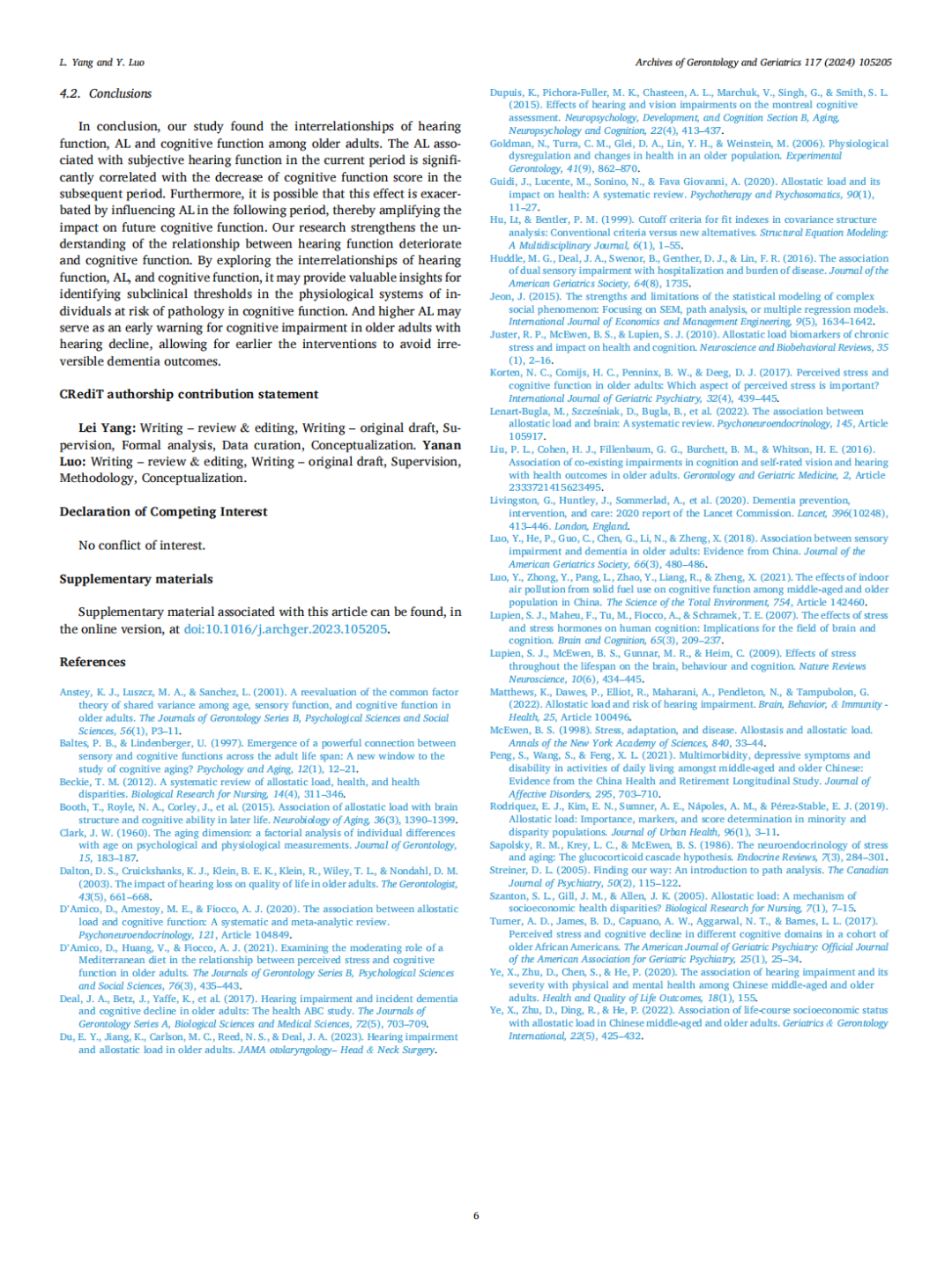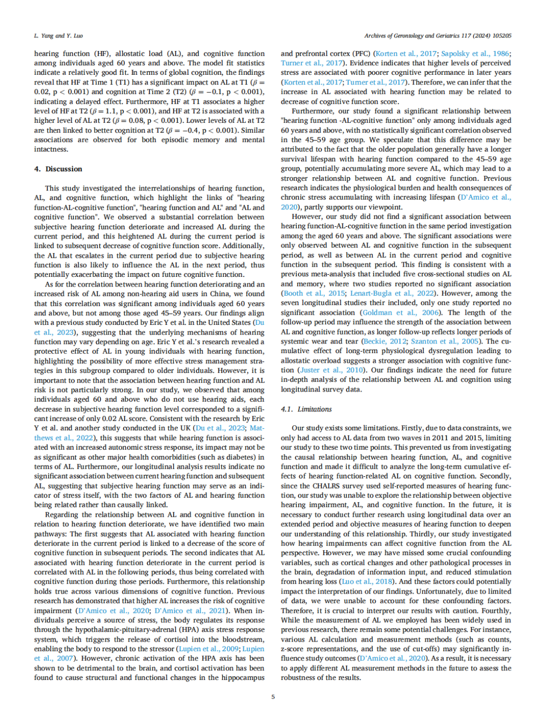 近日,金沙总站6165地址杨磊副教授与北京大学公共卫生学院罗雅楠副研究员合作的文章《The interrelationships of hearing function,allostatic load,and cognitive function: Evidence among middle-aged and older Chinese adults》在SSCI期刊《Archives of Gerontology and Geriatrics》上发表,以下为文章全文。