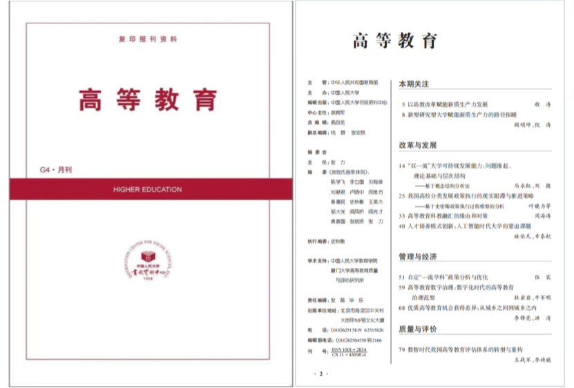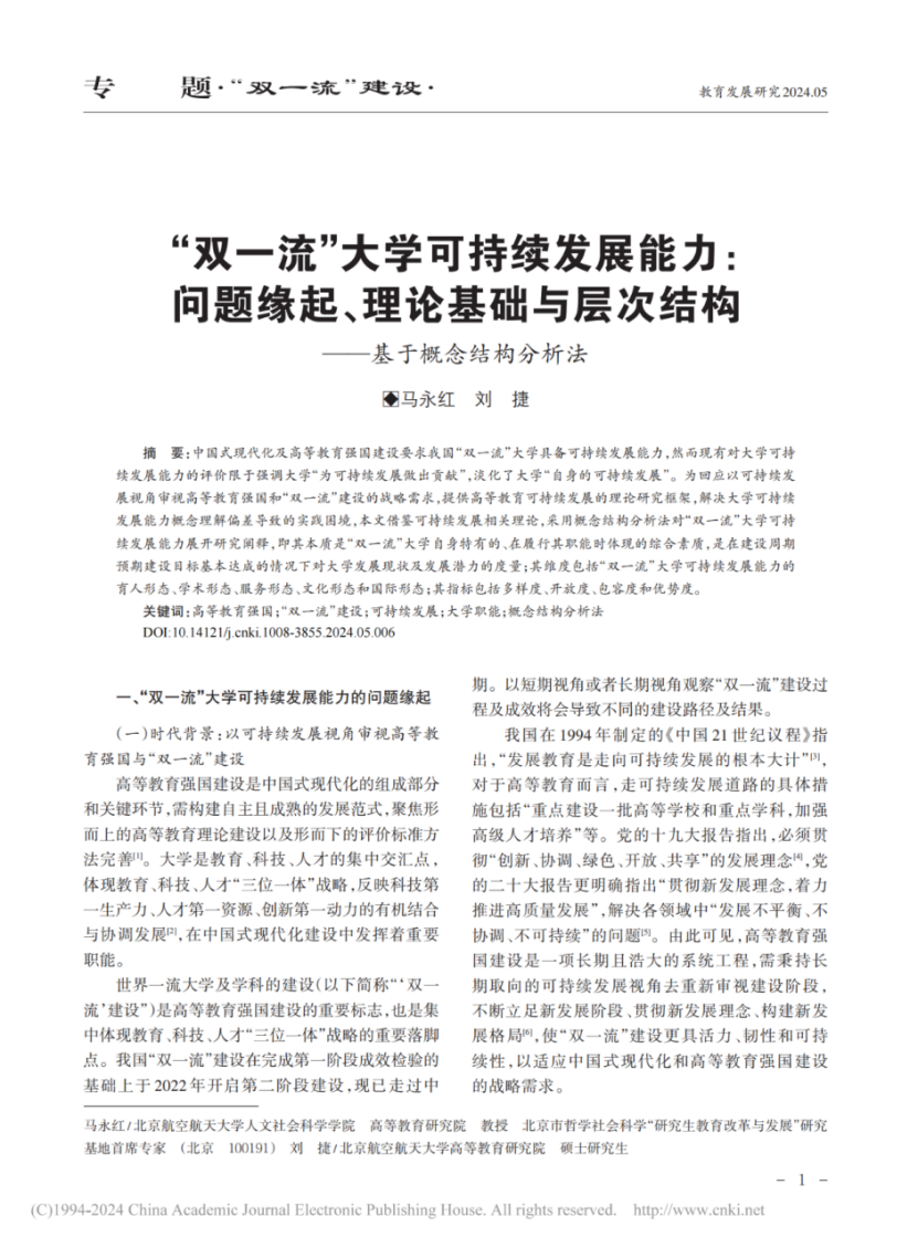 近日,金沙总站6165地址马永红教授、硕士毕业生刘捷撰写的《“双一流”大学可持续发展能力:问题缘起、理论基础与层次结构——基于概念结构分析法》(原刊发于《教育发展研究》2024年第5期),被《人大复印报刊资料·高等教育》2024年第8期全文转载。以下为文章全文。