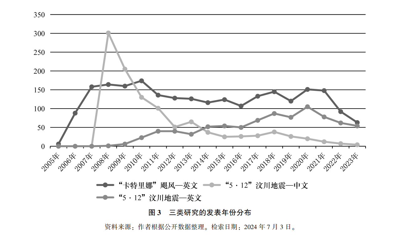 “卡特里娜”飓风是2005年发生于美国新奥尔良市及其周边地区的5级飓风,造成了超过1000人的死亡及近2000亿美元的经济损失,其应急响应及恢复过程直接推动了美国联邦应急管理署(Federal Emergency Management Agency)的改革进程。“5·12”汶川地震发生于2008年,是新中国成立以来造成伤亡和损失最大的自然灾害之一,极大地推动了我国应急管理体制机制的完善。上述两场灾害均为典型的自然灾害,发生时间较为接近、社会影响均较为重大、研究素材均较为齐备、知识生产和研究脉络也较为清晰,总体上符合经典案例分析的基本特征。但在客观上,两者造成的实际伤亡人数、经济损失等仍有一定差异。此部分将首先通过逐步“聚焦”的方式展示两者总体的中英文研究情况,随后通过对比分析进一步验证和延伸经典案例分析的要素与内容。