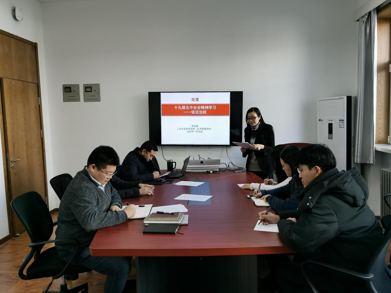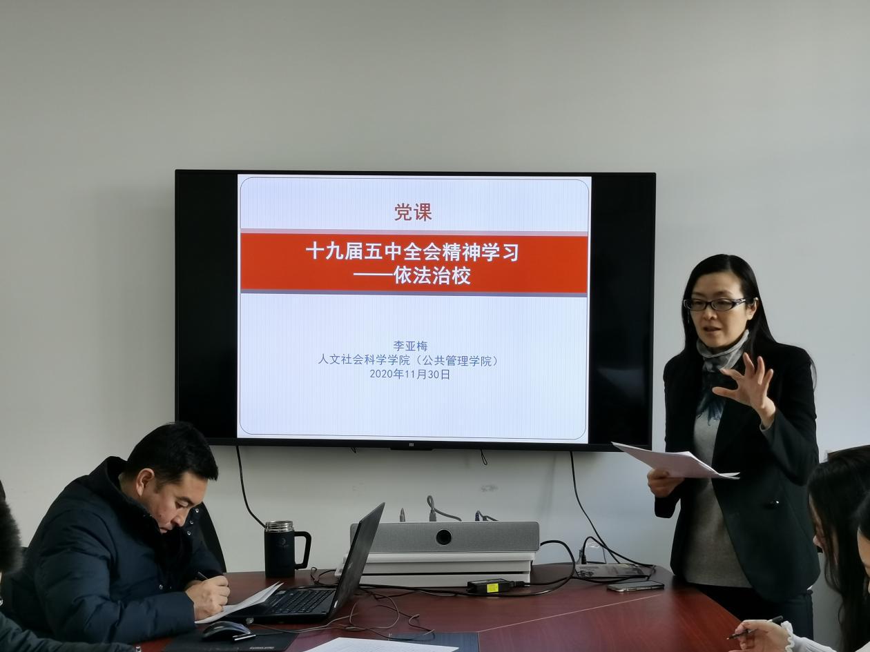 为深入学习贯彻党的十九届五中全会精神,落实依法治校新要求,11月30日上午,金沙总站6165地址“十九届五中全会精神学习——依法治校”党课顺利开展。党课由学院分党委书记李亚梅教授主讲,院党委副书记张驰、学生工作办公室成员参加学习。
