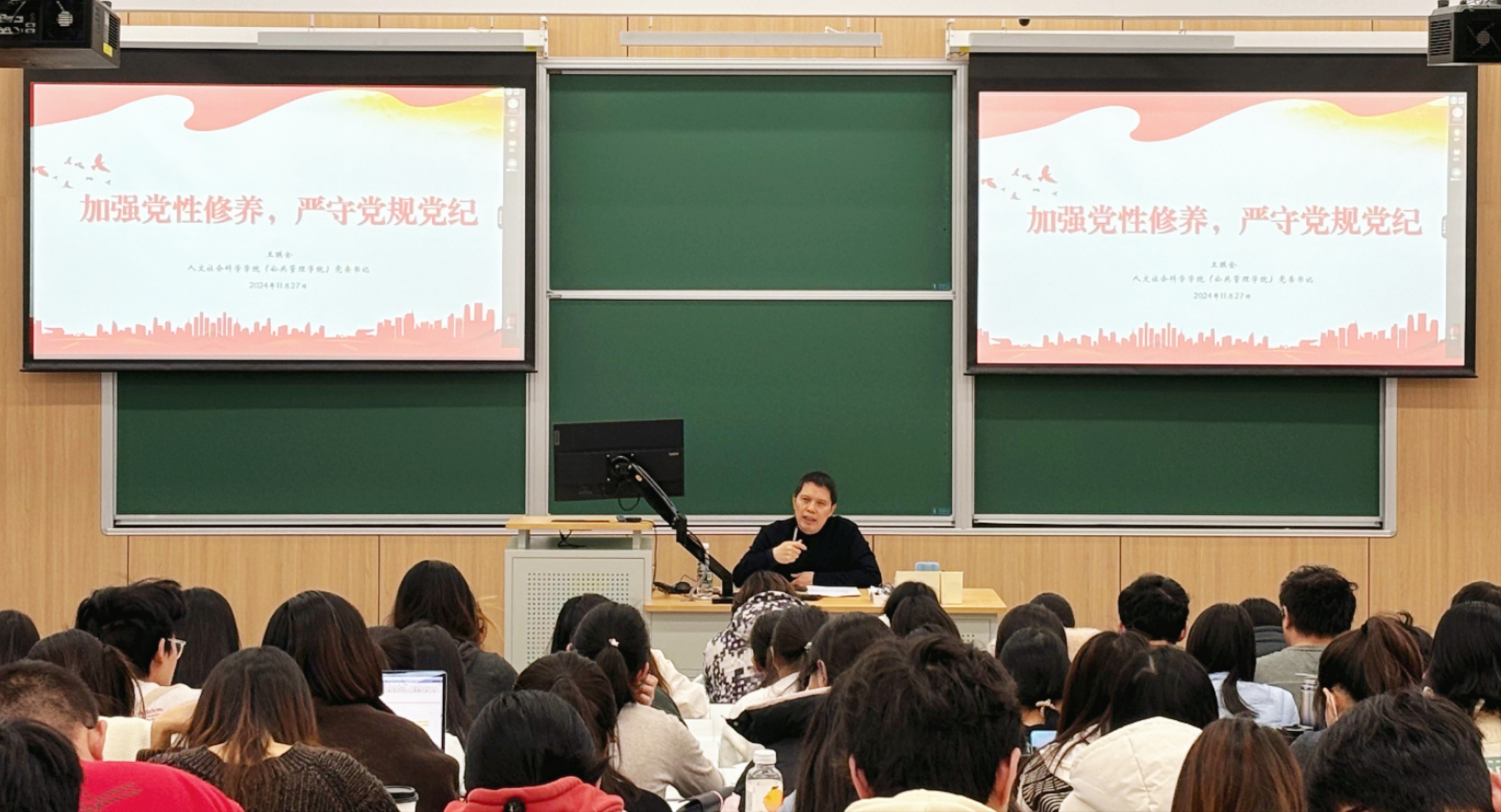 11月27日下午3点,金沙总站6165地址“铸魂育人”系列专题党课第5期在主楼219举行。我院党委书记王琪全作《加强党性修养,严守党规党纪》专题党课讲座。本次党课培训由我院专职辅导员夏文静主持,高等教育研究所党支部书记刘扬、应急管理与社会保障研究所联合支部书记杨磊和学院180余位师生党员、入党积极分子参加学习。