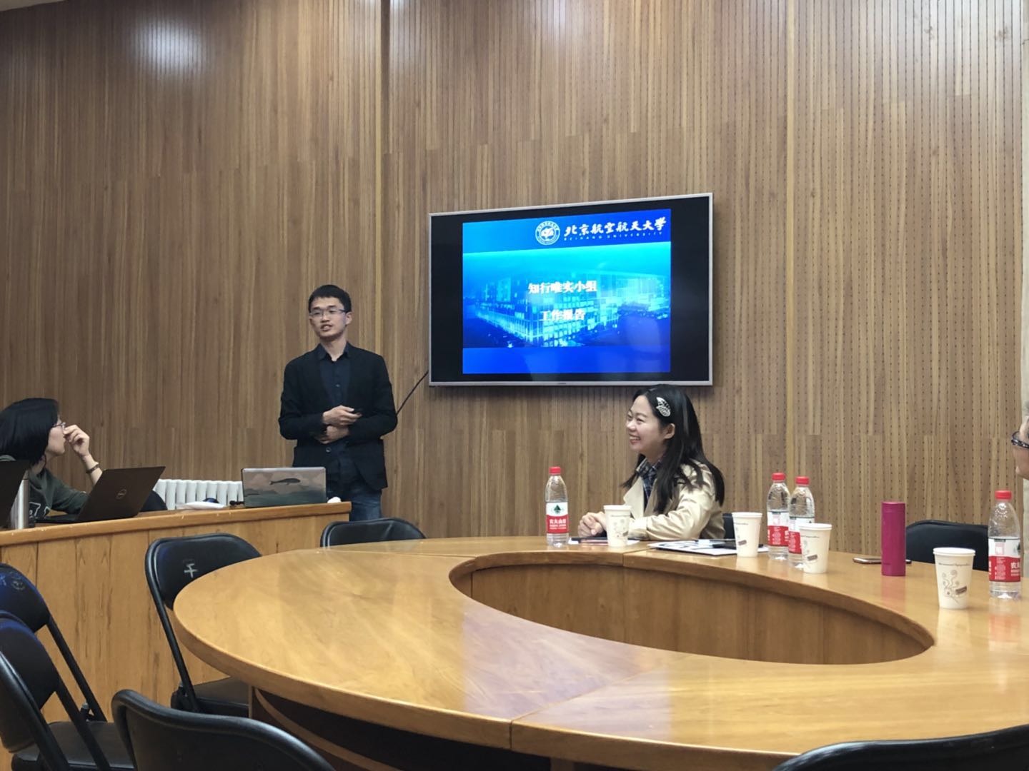 随后,人文学院博士生、17级硕士生辅导员刘鹏作为知行唯实小组的成员,向在座党员介绍了知行唯实小组的情况。人文院知行唯实小组是北京市“党的十九大精神-我学我讲我践行”评比出的50个“示范学习小组”‘之一,我校仅两个小组获此荣誉。截至目前,知行唯实小组已在北航校内外开展十九大精神宣讲活动30多次,受众3000余人次。刘鹏学长围绕“学”、“讲”、“行”介绍了小组开展活动的成功经验,分享了“读原著、听报告、小组研讨”的学习方法,介绍了开展研读班,赴门头沟、延庆区调研等的实践经验,为支部党员用行动实践十九大精神提供了宝贵借鉴。