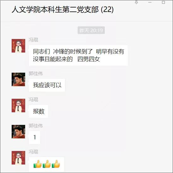 522日20:00,人文学院临时接到次日早上北航大运村首次供应早餐的任务,发布了志愿招募信息,需要志愿者们在次日早上(5月23日)配合大运村公寓盒饭服务,党员同志们积极报名,发挥先锋模范作用,“大运村售卖早餐”志愿者小分队15分钟内集结完毕。当日深夜,辅导员冯琨对次日志愿服务的时间点和工作内容进行了详细说明。