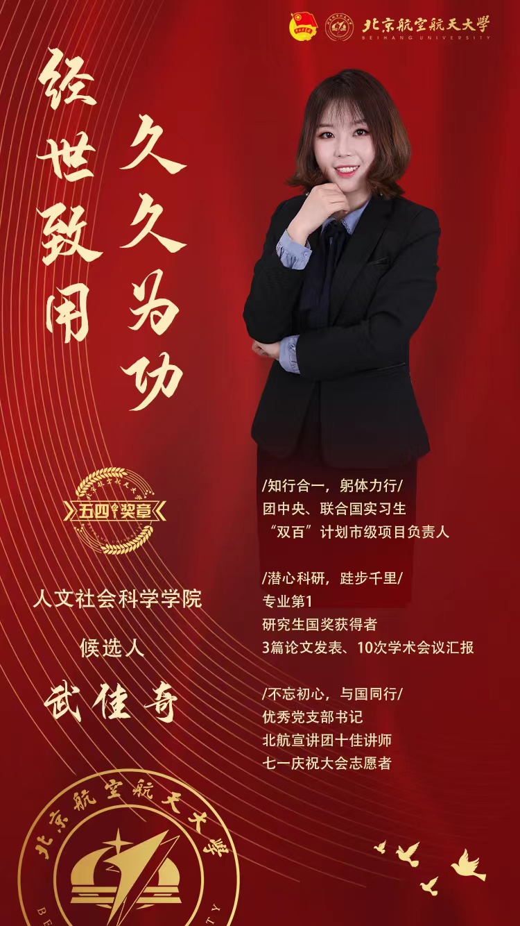 “保持好奇心和想象力,永远不要给自己的人生设限,敢想那就敢做。”她说,“我会一直在路上。”武佳奇硕士期间专业成绩93.67分,GPA3.91,名列专业第1名,获研究生国家奖学金、北京市优秀毕业生、一等学业奖学金、北京市优秀毕业论文、北航新生奖学金等,参与北京市、校级演讲比赛、知识竞赛,获得优异成绩。曾于香港大学、圣彼得堡理工大学交换学习。目前,武佳奇已被北京大学政府管理学院博士录取,将于今年九月开启博士生涯的科研和学习,将继续进行风险治理、应急管理相关研究,“正如贝克所言,我们生活在文明的山火上,风险社会中我们需要关注的还有很多。面对层出不穷的风险挑战和大变局时代,要有青年的担当。”