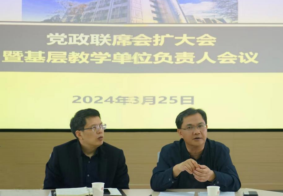 3月25日下午,学院召开党政联席会扩大会暨基层教学单位负责人会议,专题研究部署基层教学单位落实人才培养主体责任重点工作。学院领导班子全体成员、各系所主任和所长出席会议。会议由蔡劲松院长、王琪全书记共同主持。