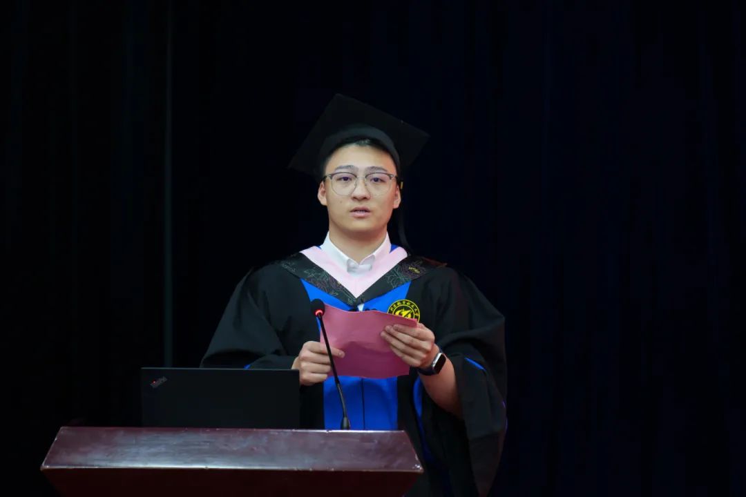 本科毕业生代表冯泓树同学对学校学院、老师们表达了崇高敬意和衷心感谢,感恩学院所给予的高起点,感恩学院课程所给予的新认知,感恩学院平台所给予的发展与机会。
