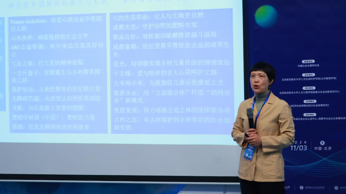 中国人民大学商学院王建英副教授围绕《从个案调研看中国社会企业双目标的管理实践》进行分享。她指出,人大商学院自2017年起致力于社会企业教学案例开发、教学及社会企业家精神倡导。目前已出版三本相关案例集,其主题分别是创造性地破解社会难题、社会使命稳健性的概念与实践、混合目标的挑战与管理。紧接着,王教授从学术研究角度,分享了案例企业的理论关注点,如创业过程模型、创业者特质、企业战略要素多元化战略等等。最后,她从控股类型、机构协同、内部张力、利益相关者沟通等方面阐述了如何进行混合目标的管理。