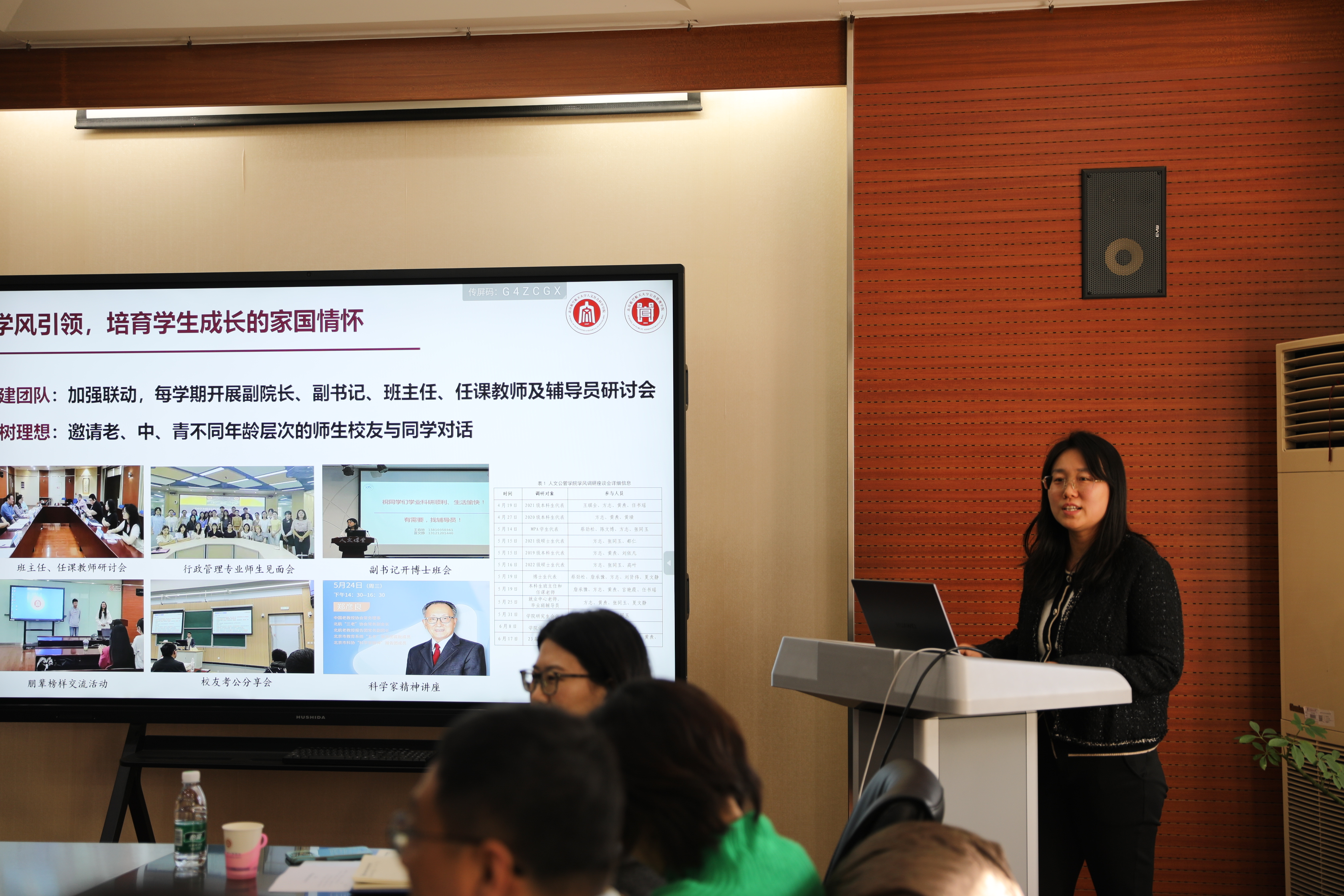 会议最后,邓怡副校长总结发言。她充分肯定了人文公管学院思政工作成绩,指出人文公管学院在学校文科中极具代表性且充满活力,学生构成多样,学科建设特色鲜明。她强调人文公管学院要不断挖掘特色,积极拓展国际交流。鼓励学生基于学科深入探索兴趣爱好,积极参与文科论坛和竞赛等活动。她着重提到要加大对社会实践和实习机会的支持力度,充分借助校友等各方力量拓宽实习实践和就业渠道。最后,她表达了对学院的殷切期望与美好祝福。